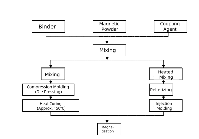 Bonded NdFeB magnets are made by combining NdFeB magnetic powder with binders like rubber or plastic, directly molded into various shapes based on user requirements. The key production steps include: