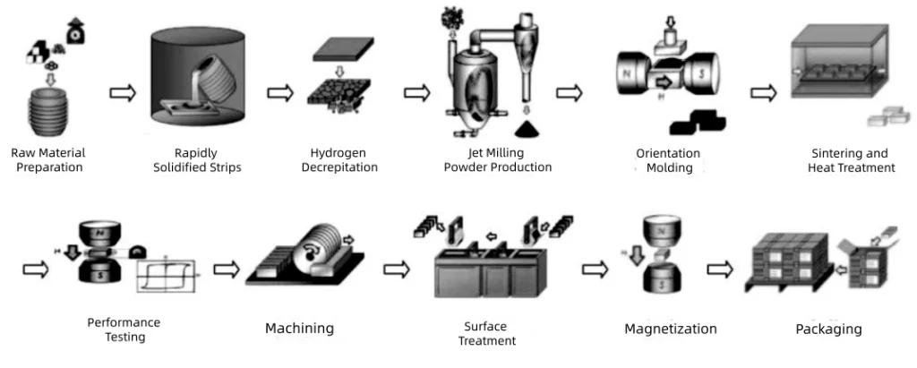Sintered NdFeB magnets are manufactured using a classic powder metallurgy process, with the following key steps:
