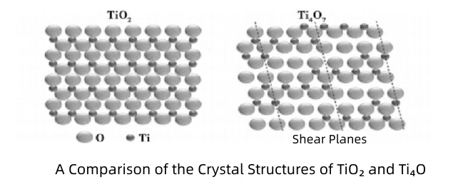 The exceptional properties of Magnéli phase titanium suboxides stem from their unique crystal structure. It can be visualized as a network of TiO₂ octahedra, but with a key difference: periodic oxygen deficiencies. For instance, in Ti₄O₇, after every few layers of TiO₂, a layer with oxygen vacancies forms. It creates a crystallographic shear plane. Within these oxygen-deficient layers, titanium atoms are closer together, forming conductive chains or bands. Crucially, these conductive pathways are shielded by the stable TiO₂ layers on either side, which grants materials like Ti₄O₇ their exceptional combination of high electrical conductivity and strong corrosion resistance.